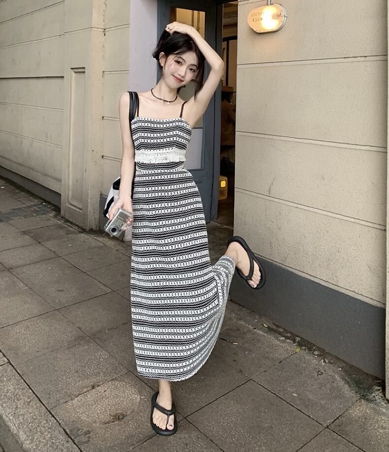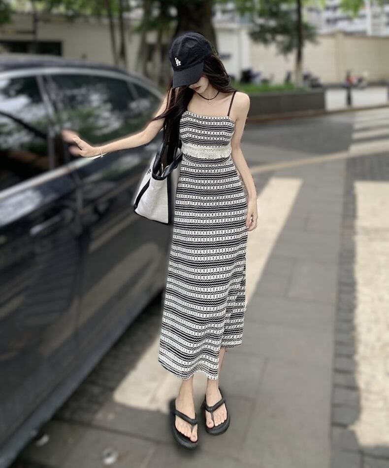 ワンピース キャミワンピース ジャガードキャミワンピース ロング マキシ丈 袖なし Aライン ドッキング バックスリット 切り替えデザイン ハイウエスト 大人可愛い おしゃれ アジアン こなれ感 存在感 ボーダー 春 夏 レディース デート お出かけ 休日 旅行 普段使い 韓国系 スタイル 楽ちん 体系カバー 送料無料 M L XL 2XL 3XL 4XL