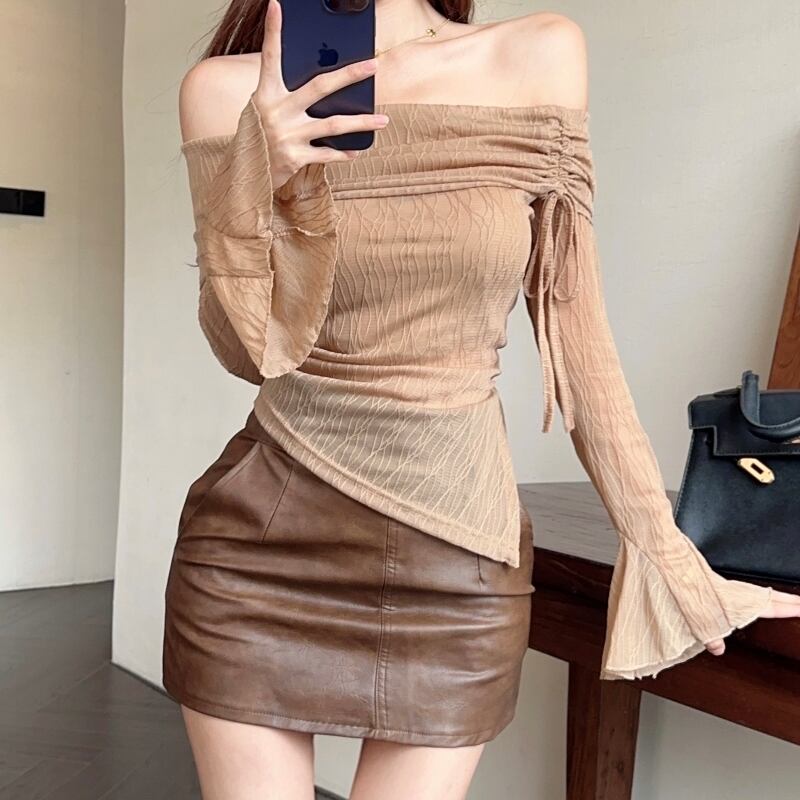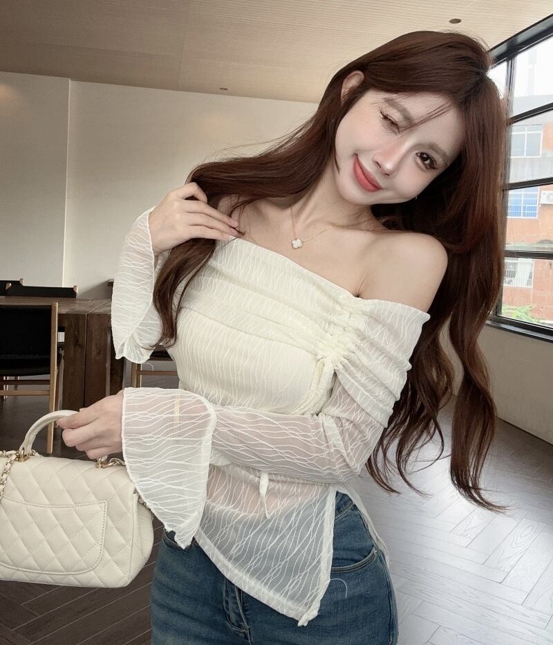 トップス シャツ ブラウス 長袖 オフショルダー 透け感 薄手 シャーリングアシンメトリー 大人可愛い おしゃれ キュート 春 夏 レディース デート お出かけ 休日 旅行 普段使い 韓国系 スタイル 体系カバー 送料無料 フリーサイズ