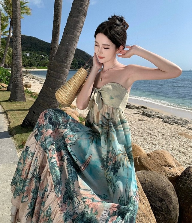 ワンピース ティアードワンピース ワンピドレス ロング マキシ丈 袖なし オフショルダー Aライン 総柄 切り替えデザイン ハイウエスト 薄手 大人 おしゃれ お洒落 アジアン 個性的 存在感 春 夏 レディース お出かけ 休日 パーティー リゾート 旅行 海 韓国系 スタイル 楽ちん 送料無料 S M L