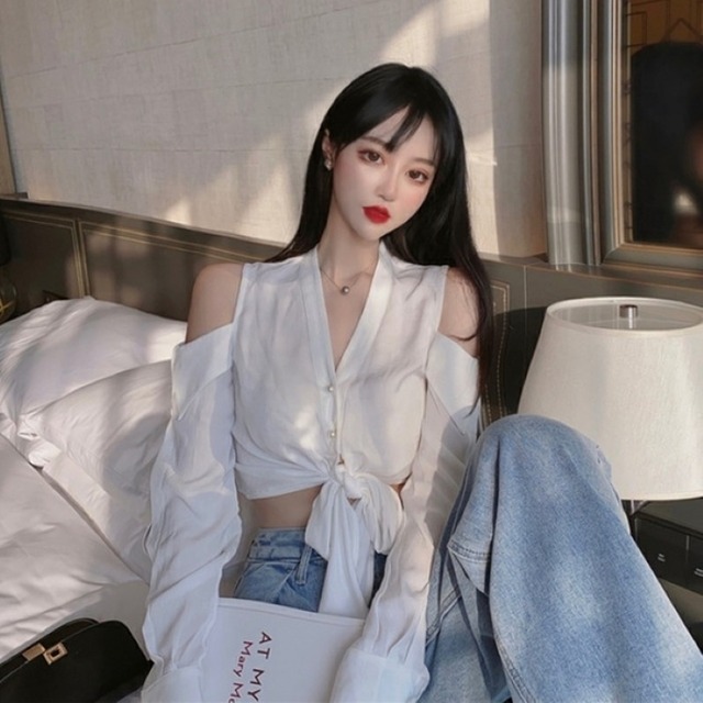 トップス ブラウス ショート 長袖 Vネック ウエストリボン バックリボン 前開き パフスリーブ 大人可愛い おしゃれ かっこいい 個性的 クール 春 夏 秋 レディース お出かけ 休日 旅行 普段使い 韓国系 スタイル 体系カバー 送料無料 S M L ホワイト ブラック