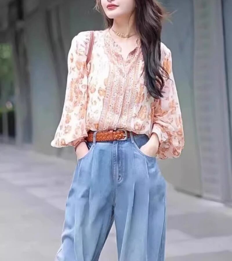 トップス シャツ ブラウス 花柄シャツ カットソー 長袖 パフスリーブ Vネック シフォン 薄手 きれいめ 大人 上品 おしゃれ お洒落 存在感 花柄 春 夏 秋 レディース お出かけ 休日 旅行 普段使い 送料無料 S M L XL
