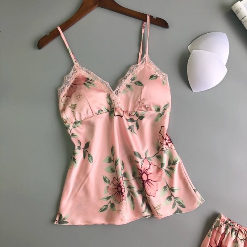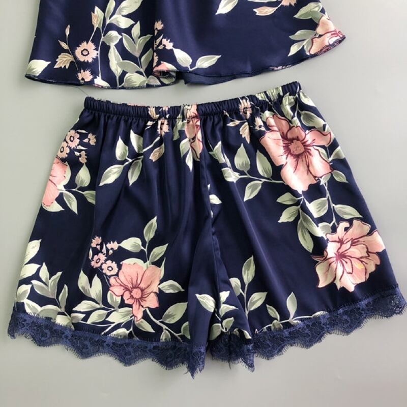 セットアップのルームウェアパジャマセット。トレンドの花柄デザインとレースアクセントが可愛い2点セットです。キャミソールはカップ付きでバストをしっかりサポートし、ショートパンツはウエストゴムで楽ちんな着心地です。ルームウェアとしてだけでなく、ランジェリーセットやネグリジェとしてもお使いいただけます。