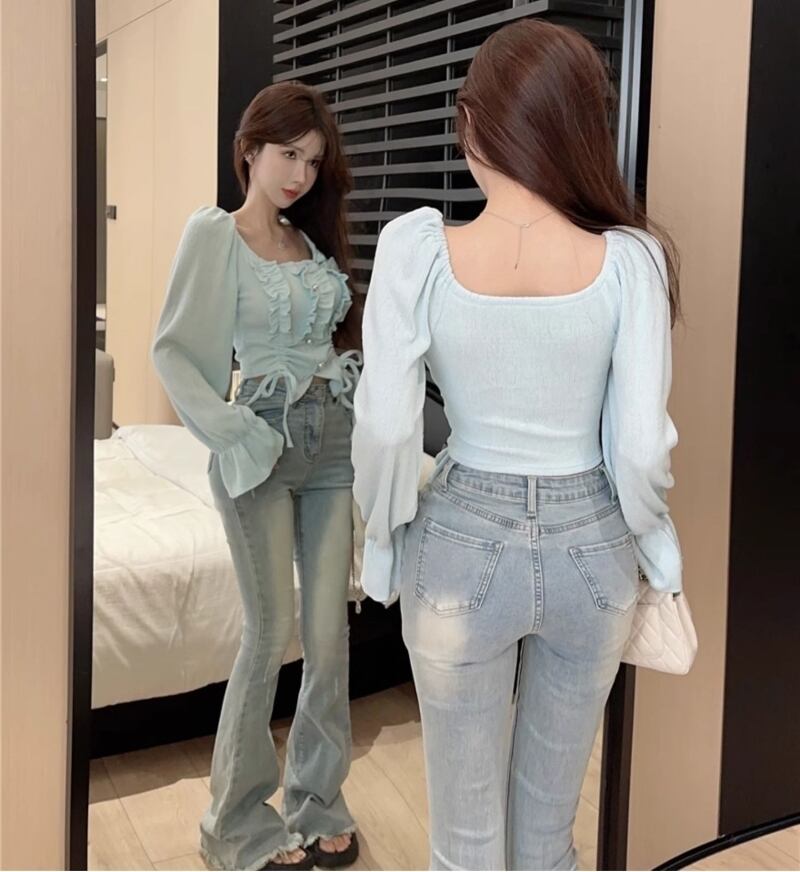トップス シャツ カットソー ショート丈 長袖 ボリューム袖 スクエアネック オフショルダー フリル ウエストリボン 切り替えデザイン 薄手 大人可愛い おしゃれ 大人女子 春 夏 秋 レディース デート お出かけ 女子会 休日 旅行 普段使い 韓国系 ファッション 送料無料 S M L ホワイト ブルー