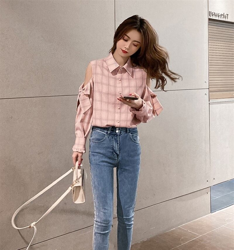 トップス シャツ ブラウス カットソー オープンショルダー 肩出し 長袖 リボン 薄手 大人可愛い おしゃれ 大人女子 チェック柄 春 夏 秋 レディース デート お出かけ 女子会 休日 旅行 普段使い 送料無料 S M L XL ピンク