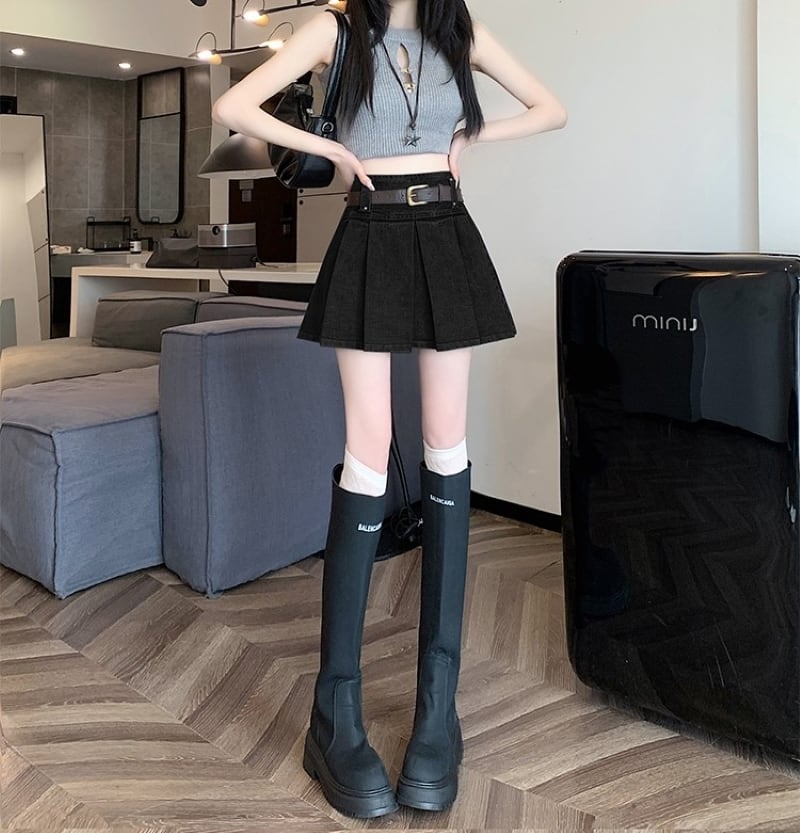 スカート ミニスカート プリーツスカート デニムスカート ショート丈 Aライン ベルト ハイウエスト デニム 薄手 シンプル おしゃれ 大人可愛い 存在感 無地 春 夏 秋 レディース デート お出かけ 休日 旅行 普段使い 韓国系 スタイル 脚長 定番 送料無料 S M L XL ブラック ブルー
