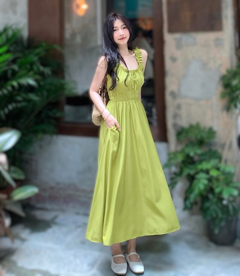 ノースリーブでロング丈のシャーリングフレアワンピース。胸元のギャザーが女性らしい印象を与え、ウエストのシャーリングが美しいシルエットを作ります。ジャンパースカートにも見えるワンピースは、1枚で着るだけでおしゃれ感が漂います。