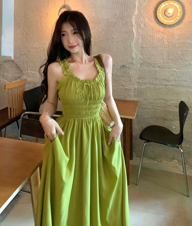 ワンピース シャーリング フレアワンピース ロング丈 ノースリーブ 胸元ギャザー ジャンパースカート 大人可愛い おしゃれ 大人女子 キュート 春 夏 レディース デート お出かけ お泊まり 休日 旅行 海 普段使い 韓国系 スタイル 体系カバー 送料無料 M L XL 2XL 3XL 4XL 大きいサイズ ゆったり