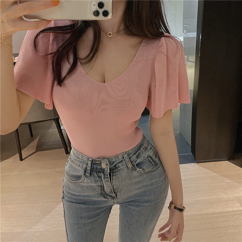 トップス Tシャツ シャツ ニットソー 半袖 フレア袖 フレアスリーブ プルオーバー Vネック サマーニット シンプル 大人 おしゃれ 大人女子 キュート 無地 春 夏 レディース お出かけ 休日 旅行 普段使い 送料無料 S M L XL ホワイト ブラック グリーン ピンク