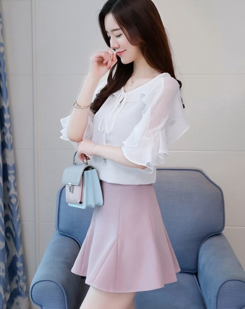 シフォン素材のトップスで、フェミニンな雰囲気を演出する5分袖ブラウス。パフスリーブとフリル、そしてリボンが可愛らしさを引き立て、上品な印象を与えます。透け感がありつつも、薄手の素材で涼しげな着心地。ゆったりとしたシルエットで、体型を気にせずリラックスして着用できます。