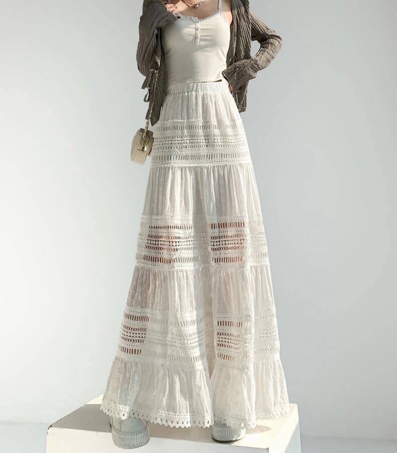 スカート ロングスカート ロング丈 ティアードスカート Aライン ウエストゴム レース 切り替え ポリエステル 薄手 大人可愛い おしゃれ 大人女子 ラブリー 存在感 無地 春 夏 レディース デート お出かけ 女子会 休日 旅行 普段使い 韓国系 スタイル 楽ちん 体系カバー 定番 送料無料 S M L XL ホワイト