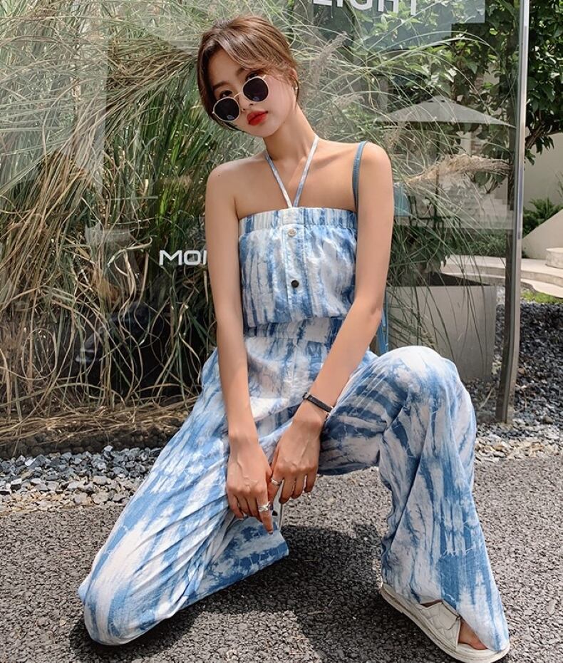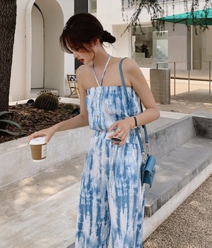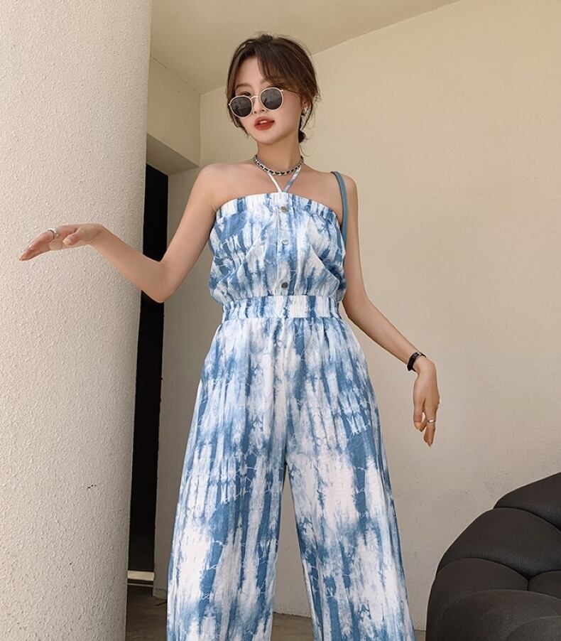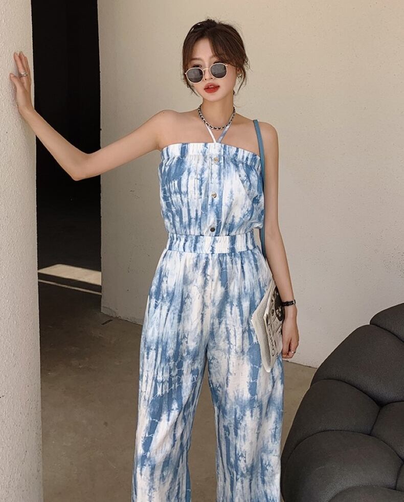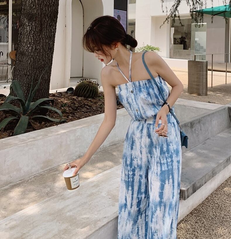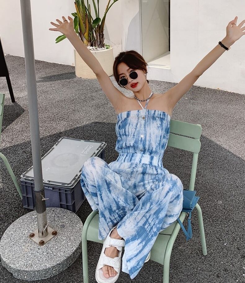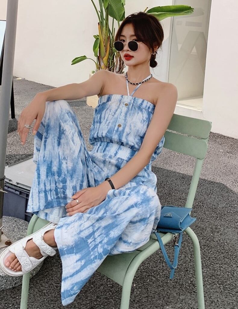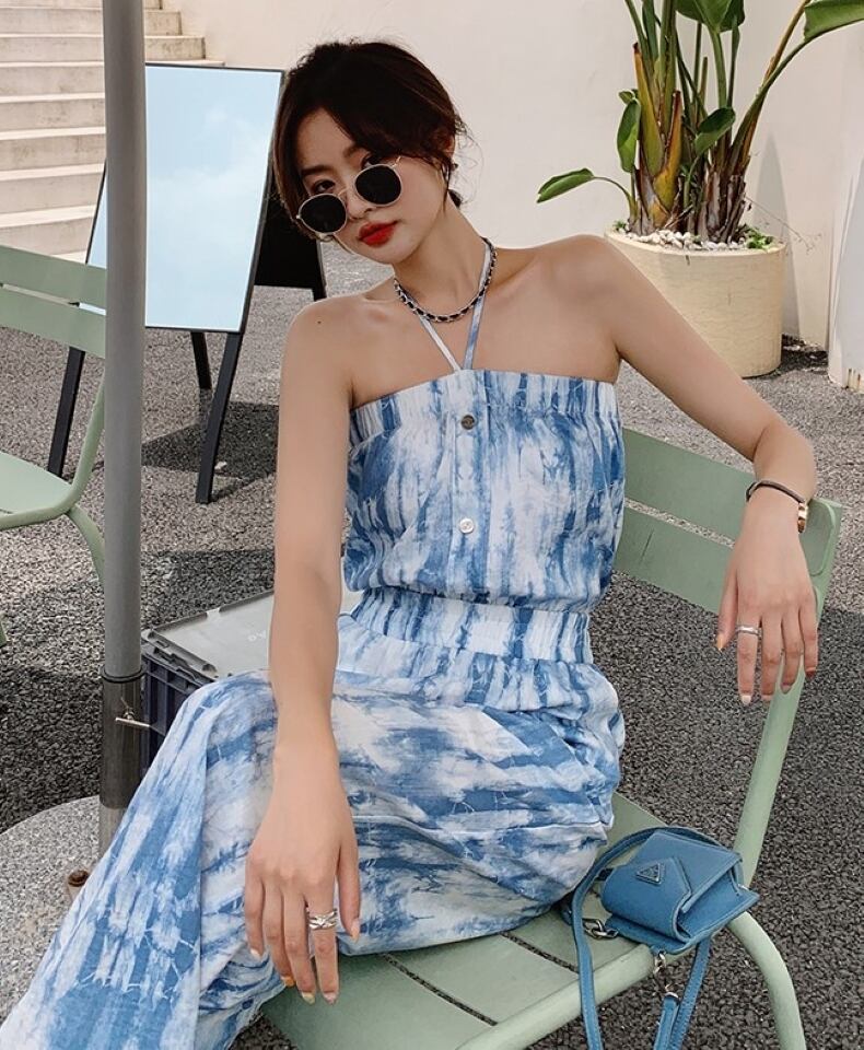 ワンピース オールインワン サロペット ワイドパンツ ロング丈 ホルターネック ハイウエスト 薄手 シンプル 大人 上品 おしゃれ お洒落 クール セクシー 無地 春 夏 レディース デート お出かけ 休日 旅行 普段使い 韓国系 スタイル 脚長 送料無料 S M L XL 2XL ブルー