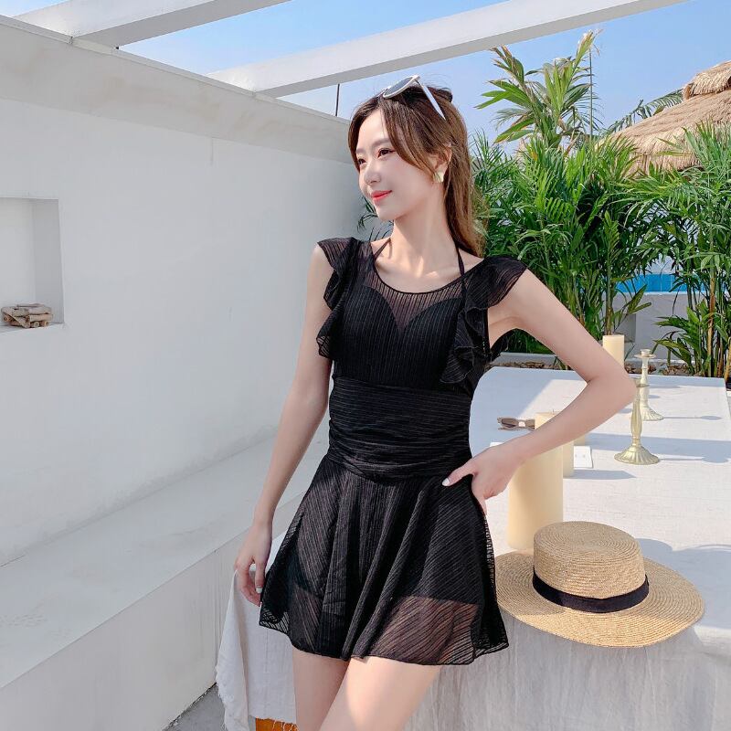水着 スイムウェア ワンピース水着 体系カバー水着 レース フレア水着 体系カバー 透け感 きれいめ セクシー 大人っぽい クール 無地 レディース 春 夏 海 ビーチ プール リゾート 旅行 着痩せ スタイルアップ 定番 送料無料 S M L XL 2XL ブラック