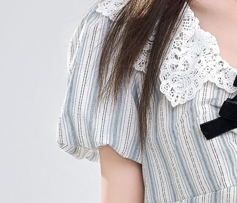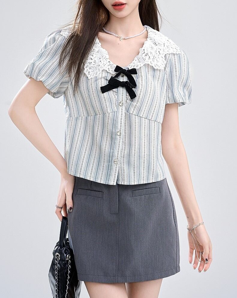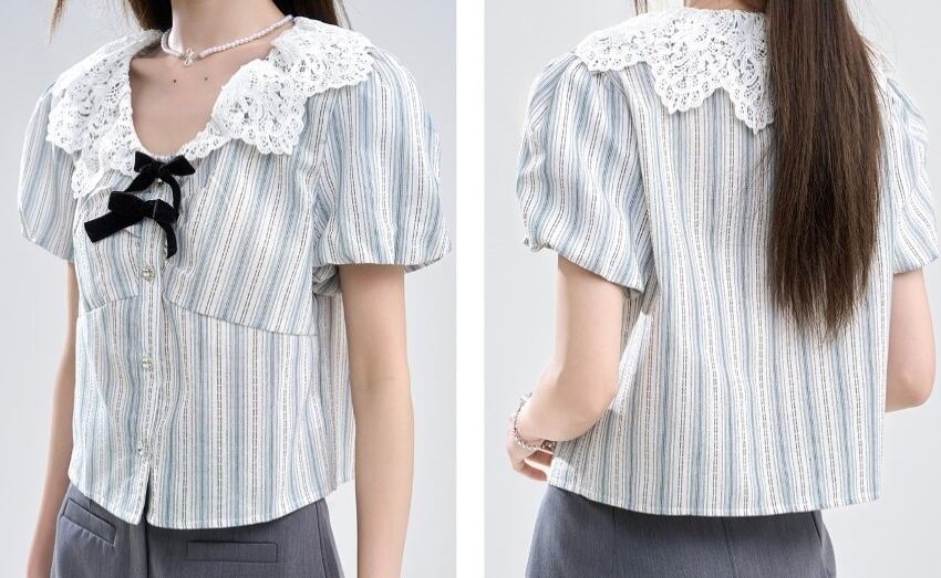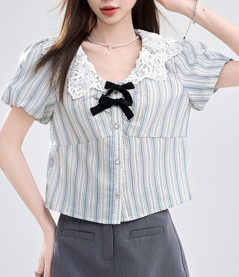 トップス レディース ショート丈 ブラウス パフスリーブ シャツ ストライプ 半袖 レース リボン 大人可愛い おしゃれ 大人女子 存在感 フォーマル ストライプ 春 夏 お出かけ 休日 旅行 普段使い 韓国系 スタイル 送料無料 S M L XL