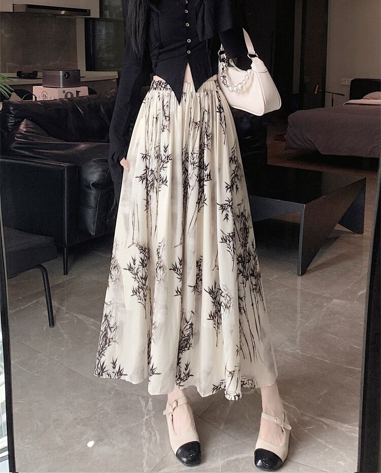 スカートのミモレ丈でフレアースカートに、軽やかな素材と優美な水墨柄がおしゃれさを引き立てる一枚。気になるウエスト部分はゴム仕様で快適な穿きごこちを実現。立体的なAラインシルエットが美しい動きを演出し、女性らしさを引き立てます。