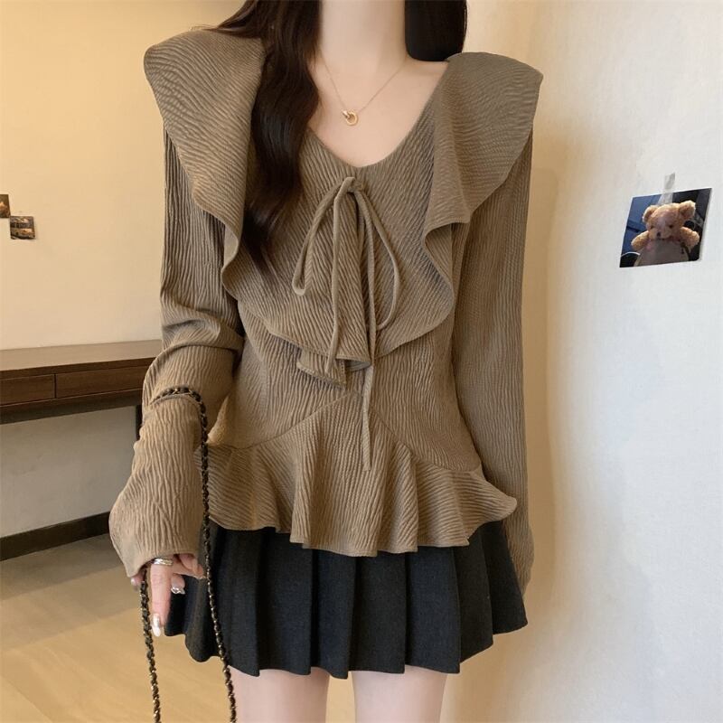 トップス ブラウス 大きいサイズ 長袖 Vネック Aライン フレア プルオーバー リボン フリル 薄手 大人可愛い おしゃれ 大人女子 キュート 春 秋 メンズ デート お出かけ 休日 旅行 普段使い 韓国系 スタイル 体系カバー 送料無料 M L XL 2XL 3XL 4XL ゆったり ブラック カーキ