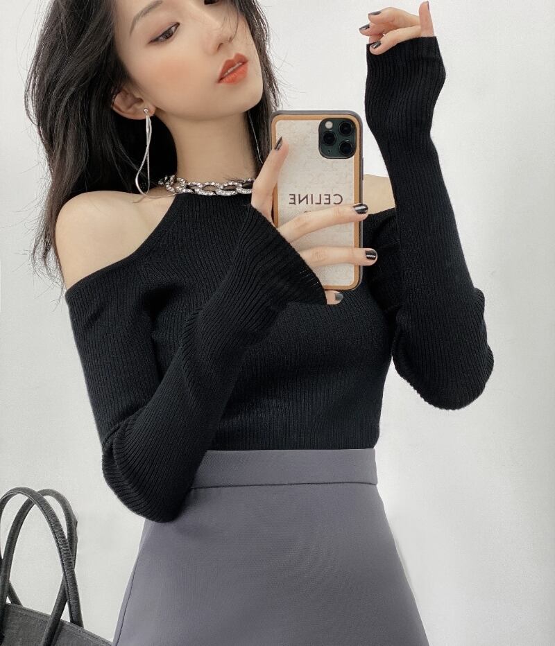 おしゃれでセクシーな印象を与えるオフショルダータイプのセーターです。ユニークなチェーンネックがアクセントになり、リブニットのデザインが体のラインを美しく引き立てます。長袖で首元もしっかりと暖かく、トレンド感のあるアイテムです。ストレッチ性のある素材で着心地も抜群