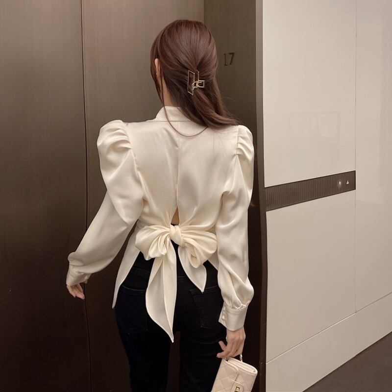 トップス シャツ ブラウス パフスリーブ 長袖シャツ ウエストバックリボン 襟付き シフォン きれいめ 大人 上品 おしゃれ お洒落 エレガント 存在感 春 秋 冬 レディース デート お出かけ 女子会 休日 旅行 普段使い 韓国系 スタイル プレゼント 送料無料 インスタ映え S M L ホワイト ブラック ベージュ