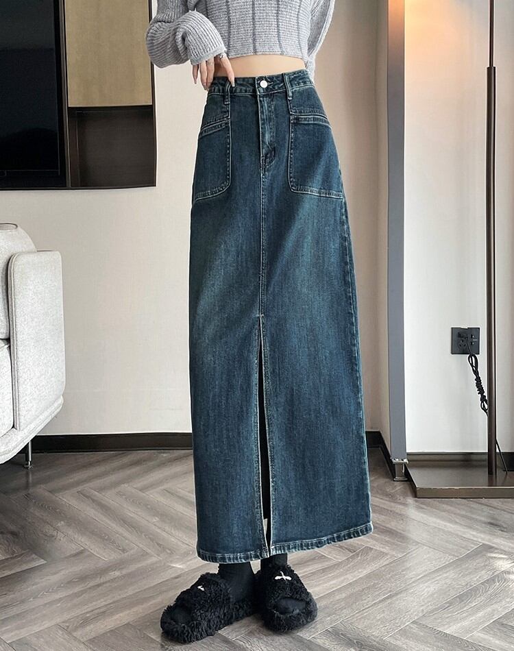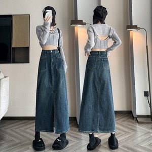 ハイウエストデザインがウエストを引き締め、脚長効果を実現します。ポケット付きで実用性も兼ね備えたこのデニムスカートは、シンプルながら存在感があり、春秋冬の季節にぴったりです。カジュアルなスタイルから少しセクシーなコーディネートまで、幅広く活用できるのが魅力です。